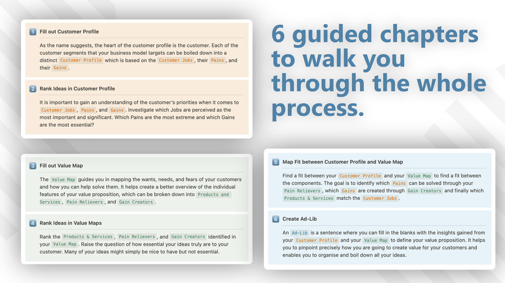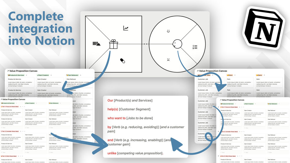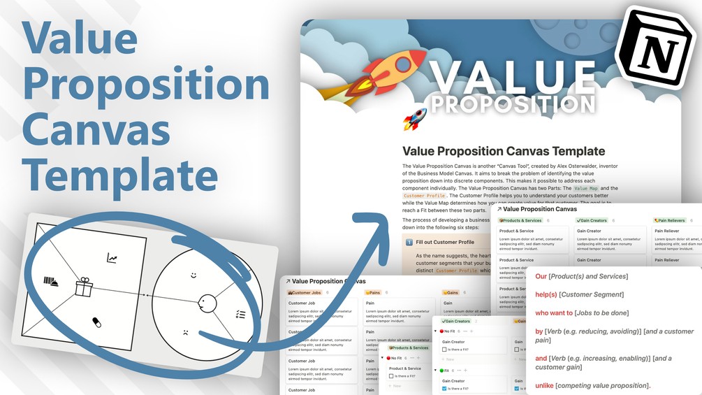 The Value Proposition Canvas developed by the Swiss business theorist Osterwalder, inventor of the Business Model Canvas, helps you determine how the product or service you offer creates value in your customer’s life. This Notion template applies the methodology of Osterwalder and helps you break down the problem of identifying the value proposition down into discrete parts which enables you to address each part, step by step.