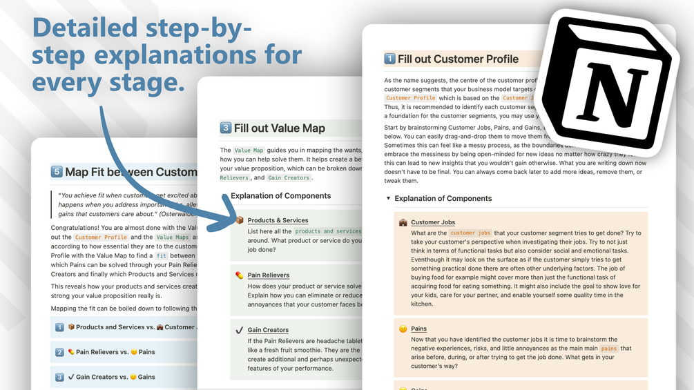 For people who want to learn how to create meaningful products and services that target real-world customer pain points. This template translates Osterwalder’s methodology behind his Value Proposition Canvas into Notion and breaks the process into easy to follow steps.